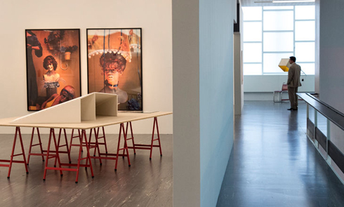 Preßspanplatte 207x280 cm, Objekt aus Wabenpappe 41x120x130 cm, weiß, Zeichnung, Aquarellstift, diverse Bildmaterialien, Glasplatte, Metall-Tischböcke